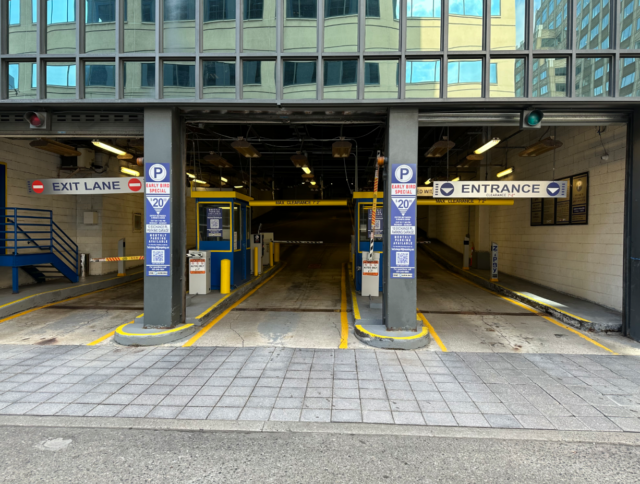 Enter this location on Hudson St, at the intersection of Exchange Pl and Hudson St. The entrance is on the east side of Hudson St and has a blue “P” on the exterior entrance. This is a One Parking self-park facility located in Jersey City, NJ.