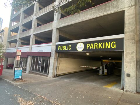 The garage’s entrance is located on the right hand side of 8th St. in between Grace and Franklin St. Look for the Pivot Public Parking sign on the sidewalk.