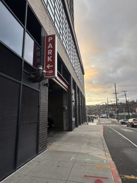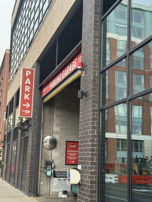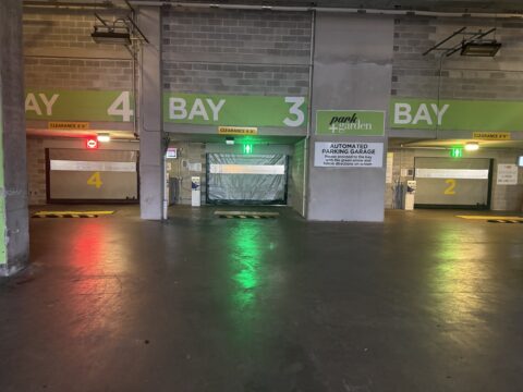 The Park + Garden residential building in Hoboken features a unique, compact U-tron automated parking garage with 314 spaces, which uses robotic shuttles to store vehicles on racks instead of traditional ramps, freeing up space on the ground level for a recreational deck with a pool. This technology allows for increased capacity in a smaller footprint, making the building eco-efficient and more profitable by allowing for more residential units. The garage is now operated by the City of Hoboken and is used by residents for both monthly parking and as a public parking facility.
