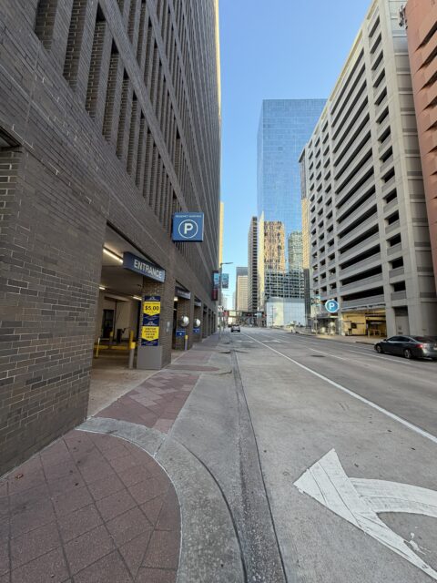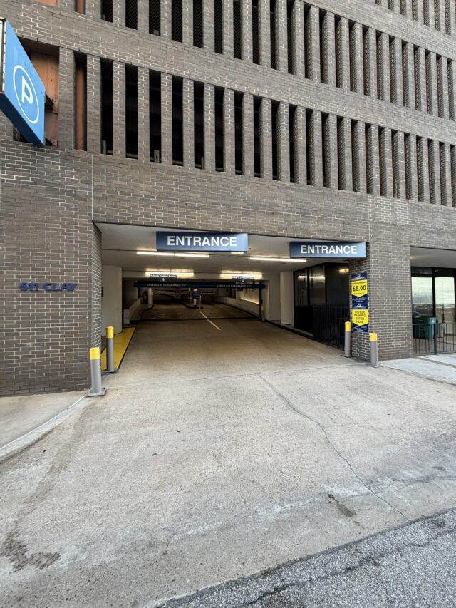 If you’re coming from I-45 (Gulf Freeway), the first entrance is Clay Street on the left. The other two entrances can be accessed by making left turns around the building, all located in the left lanes. Look for the blue sign (P) indicating the entrances.