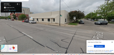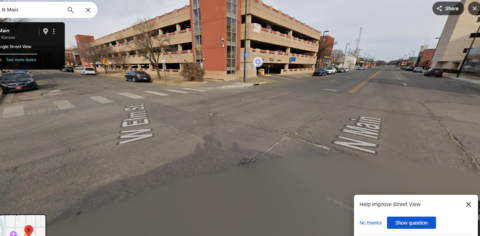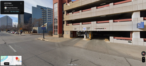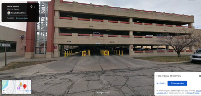 The public garage at 603 N. Main has entrances on the east side on Elm and main street and the employee garage(keycard only is location on water and pine street If you are on 54 HW (Kellogg take the cental business district exit, take the main street exit going north to elm street and you will see the Sedgwick County parking garage public garage. If needing the employee garage go north 1 more block and fine pin street for the keycard only garage.